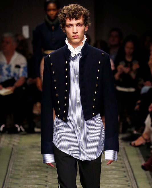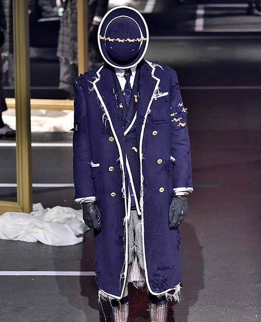 Having trained on Savile Row, Alexander McQueen was well known for the precision of his tailoring, and in his absence, his namesake house continues to deliver excellence the way it cuts cloth for the body. In a dark-toned collection, the British housed showed double-breasted wool coats cropped above the thigh and sharpened at the waist by a belt, with silver buttons, epaulettes and contrasting detachable velvet collars as part of its collection. Thom Browne, the maverick American designer, did what he does best: continued to reinvent the suit by imbuing it with surreal thematic concepts. In this case, he took beautifully tailored navy wool outerwear and shredded it – quite literally – so as to give it frayed edges, patches of exposed lining and a dramatic aesthetic quality that is testament to his ability to find newness in traditional dress.