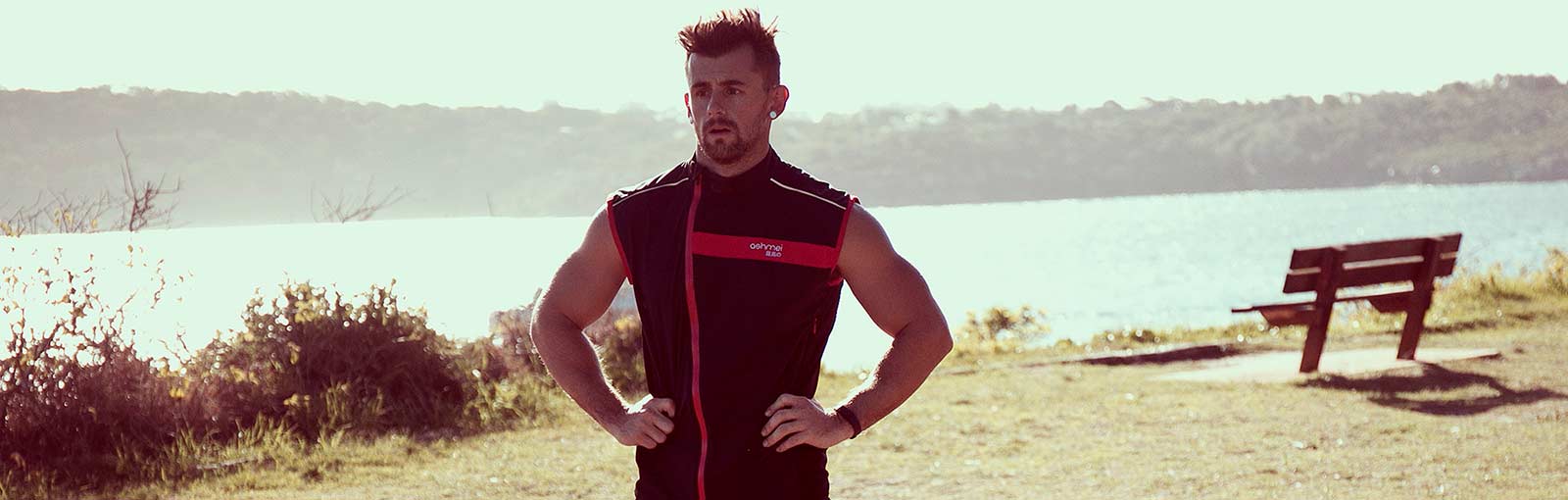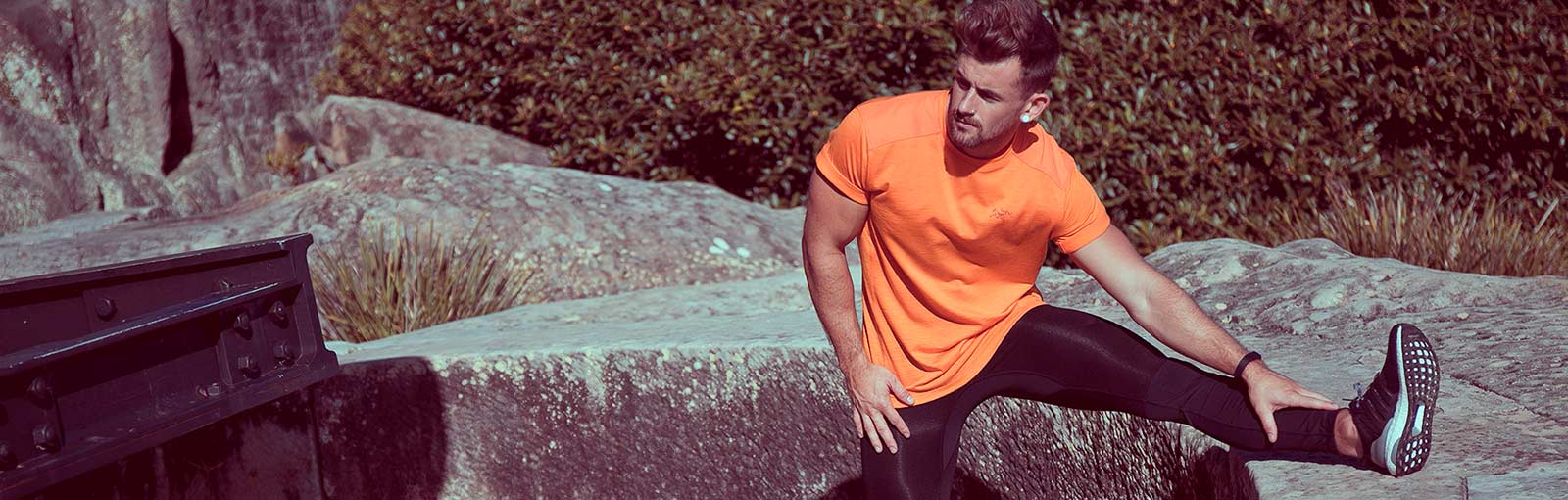 Nathan McCallum wears Ashmei Merino wool t-shirt, Australian Merino wool shorts, and FitBit watch. TOP: Arc’teryx Merino wool t-shirt, Ashmei Merino wool-blend skins, Adidas ‘Ultra Boost’ wool-blend sneakers.