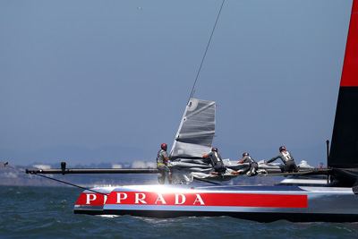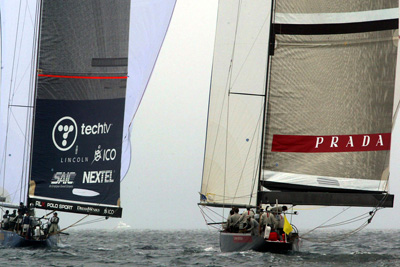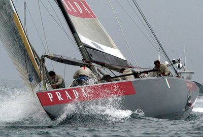 With understated, futuristic uniforms issued to the sailors on the Prada Challenge, the technical clothing, including custom-made foul-weather gear for heavy-weather days and form-fitting and tri-laminate Lycra-based spray shirts were sported in silver with a distinct red stripe featuring the Prada logo.