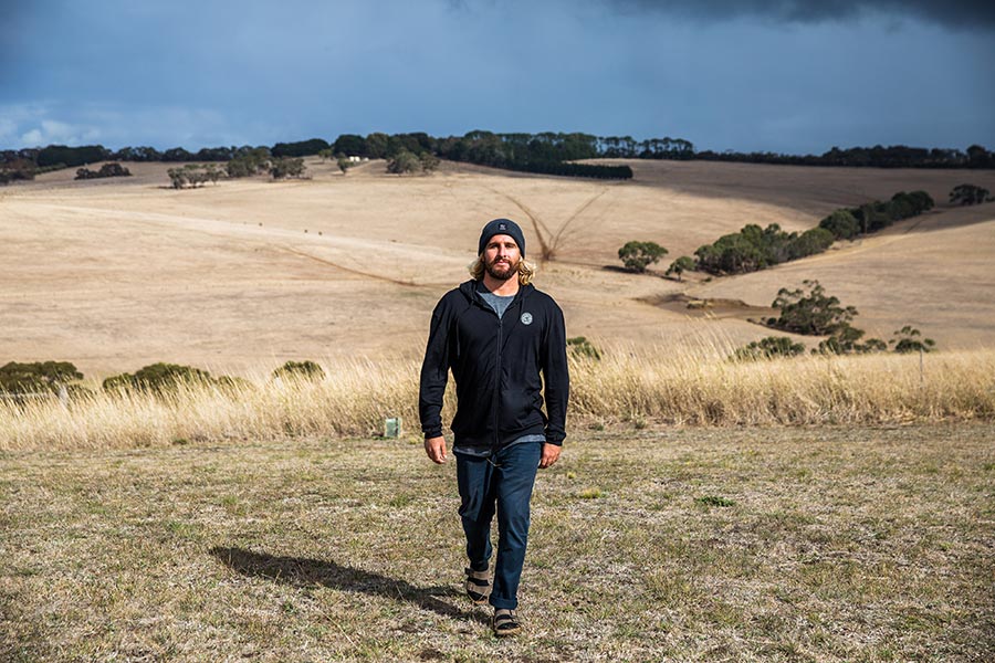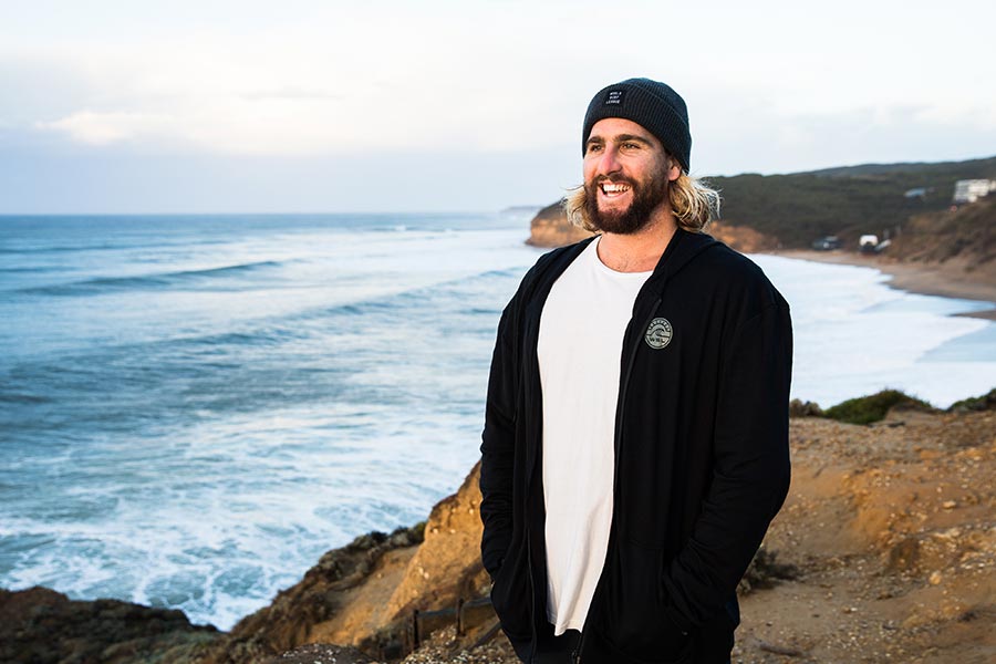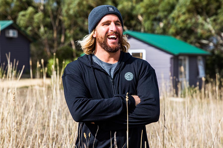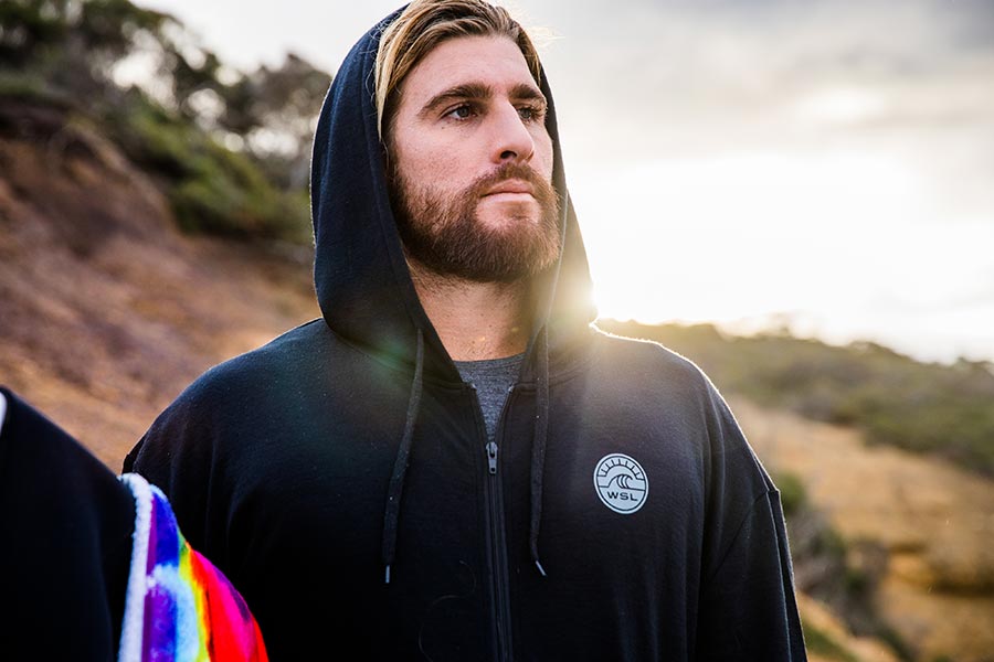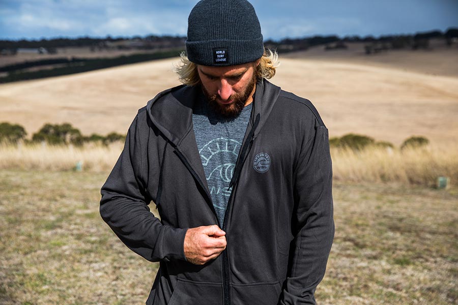 Surfer Wade Carmichael in WSL's new Merino wool apparel.