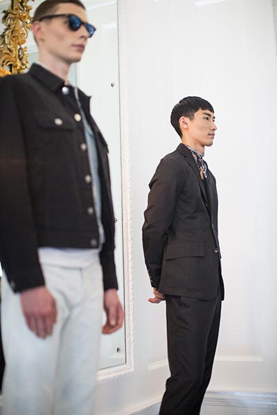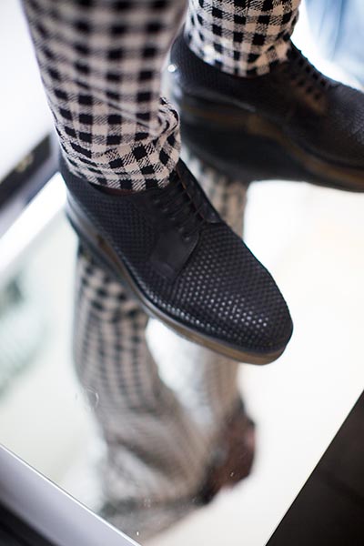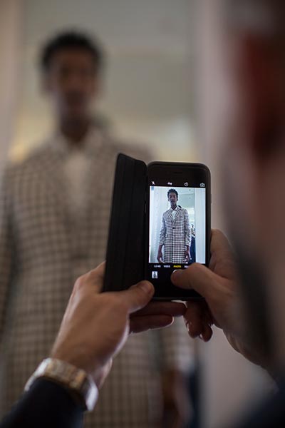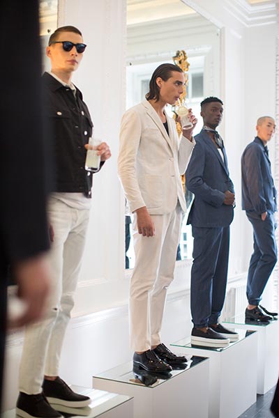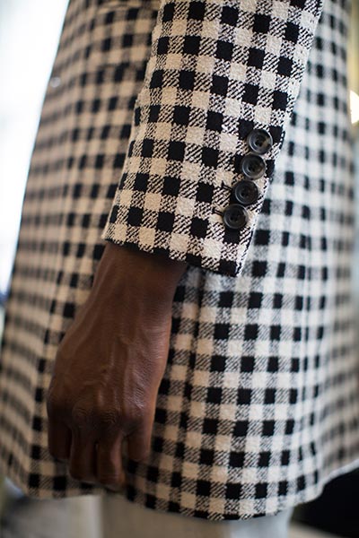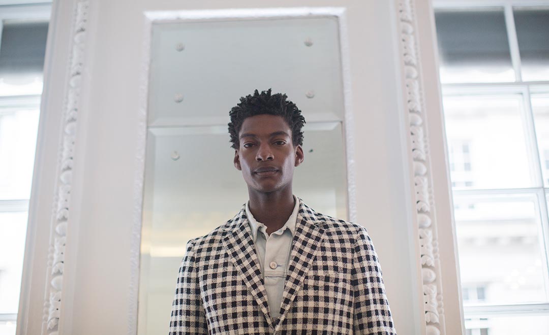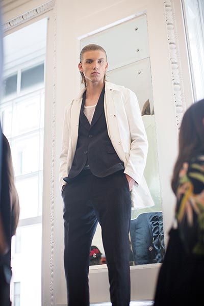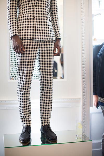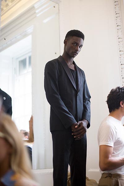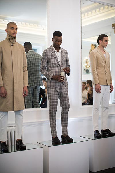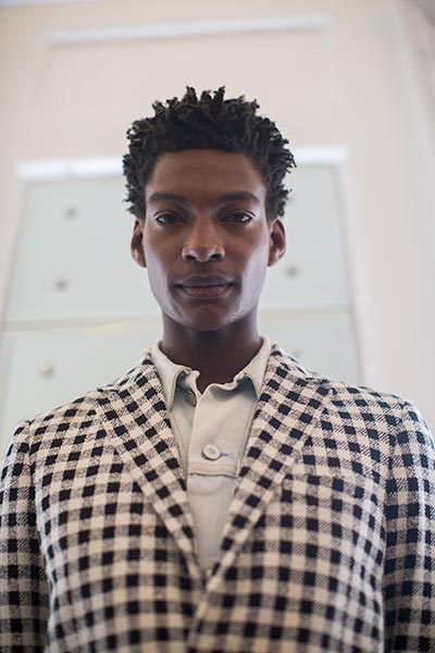 At Hardy Amies, designer Darren Barrowcliff looked to the Savile Row house’s archives. Established since the 1940s, it was rich terrain to mine, with the spring/summer 2017 collection comprising an unstructured black wool single-breasted, shawl-collared tuxedo (worn at the presentation with a t-shirt, evidence of the breaking down of tradition, even for a historic fashion house), a double-breasted plaid suit, cut close to the body and slightly cropped in the jacket and trouser legs, and lightweight two-piece suits in checks of earthy tones.