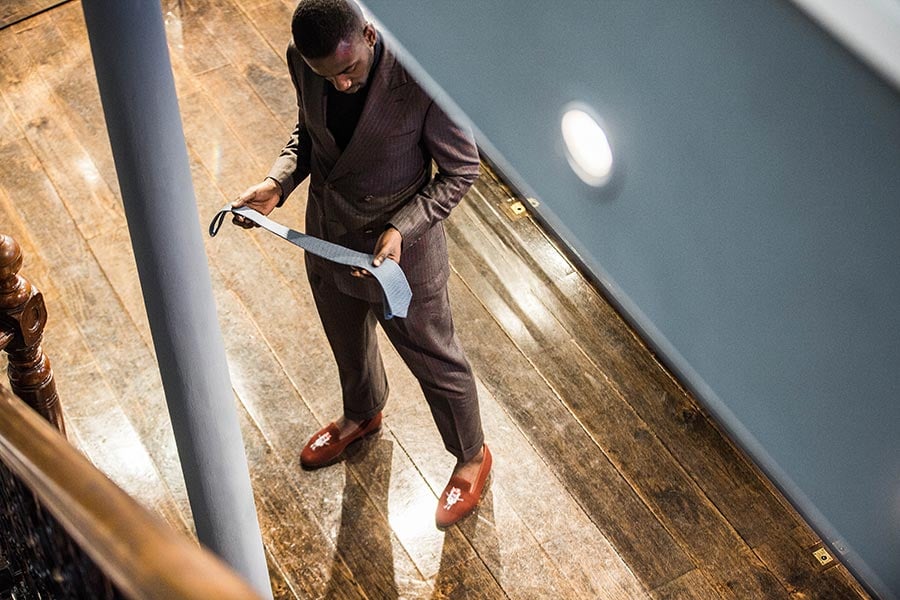 The house style, too, is very much rooted in English tailoring tradition. “Ours is a fairly classic Savile Row silhouette, although we’ve made a bit trimmer, a bit more fitted than some of the more traditional houses,” says imperiously dapper head cutter Ben Clarke, although he also points out that the approach is unique to them, and rooted very much in the fact that every customer is idiosyncratic – not just in terms of taste and needs, but anatomy too. “If you measured up 100 people in a room, you’d come up with an average physique, but I guarantee not one of those 100 people would fit into that average,” he says.