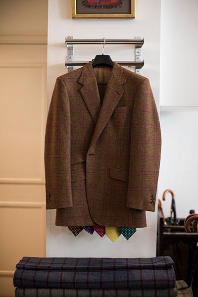 “We’ve got a nipped in waist – we start our waist-runa little higher than most - and a slanted, flapped lower pocket with an outside ticket slot. On a lounge suit we’d normally have straight pockets, with or without a flap, but on tweed, slanted looks more sporty. We have a nice slim sleeve, regular lapel, and what we do is put a little curl here on the sides of the top collar – one of our signatures. The overall effect is something that’s going to stay relevant. You’re not going to put it on in 10 or 15 years and think it’s gone out of date – it’s a real classic. It’s all in proportion, designed to grip you and look fitted but not be restricted.”
