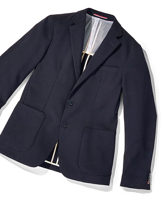Ultra-light 65% wool-cotton blend, this fully-lined suit jacket weighs less than a shirt. Micro-geo jacquard lining, with grosgrain signature stripe tape details.